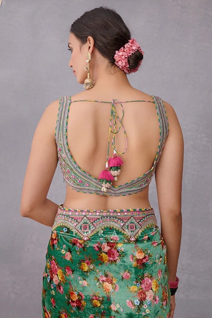 If you love modern ethnic fashion, try a back dori blouse. The tie-up strings add a trendy touch, making your saree look stylish and festive at the same time.
