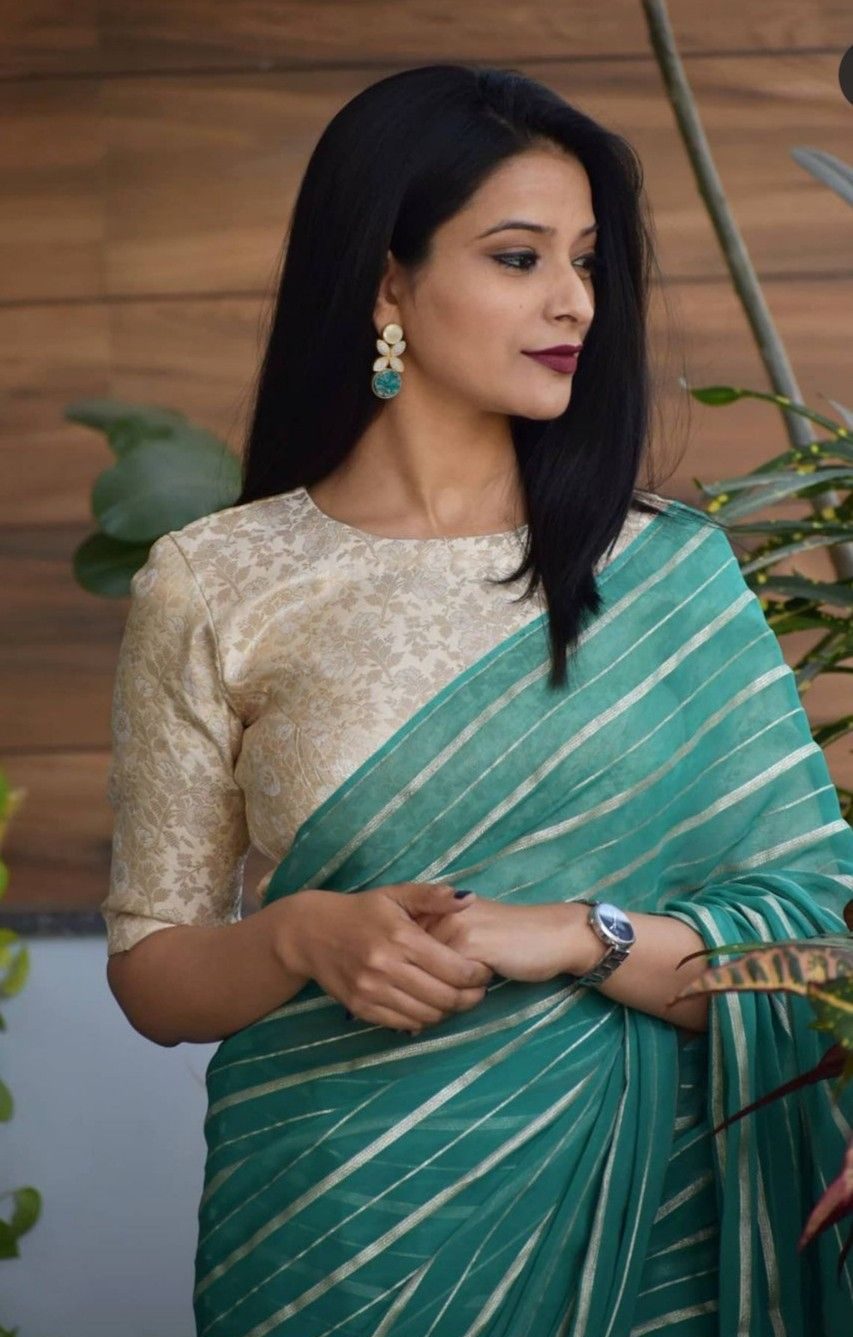 A peplum blouse gives your saree look a contemporary twist. It highlights your waist beautifully and works great with lightweight sarees.