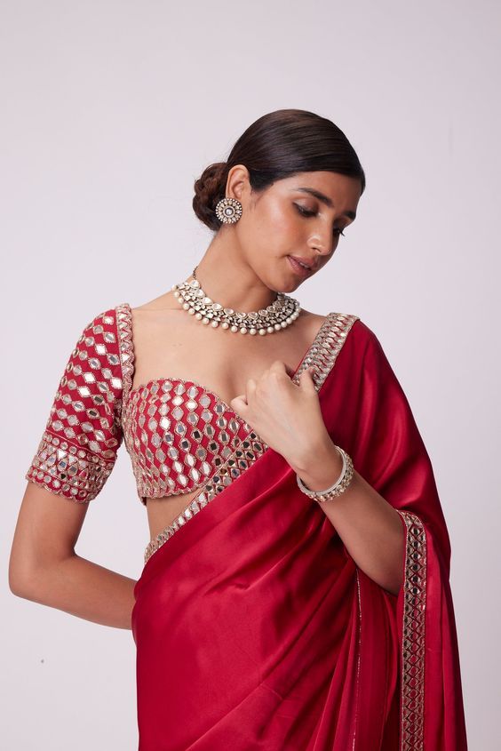 Add a touch of sparkle to your Bhai Dooj saree with a mirror-work blouse. This design looks especially stunning with plain georgette or chiffon sarees, creating a festive glow.