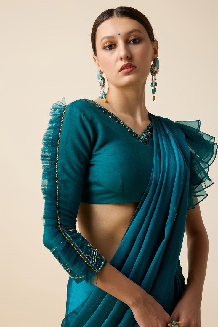 If you want to add some drama to your festive look, go for a ruffled blouse. The layers around the sleeves or neckline bring a playful yet chic vibe to your saree.