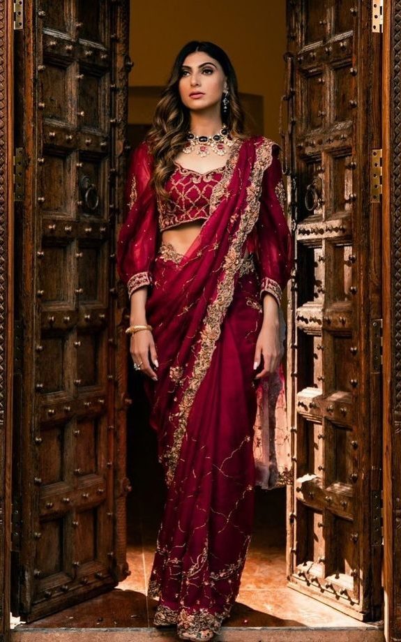 Velvet sarees are also becoming a favorite among modern brides. Bridal velvet sarees in red, maroon, or royal blue with heavy embroidery and handwork look extremely grand. They give a regal feel and are perfect for winter weddings.
