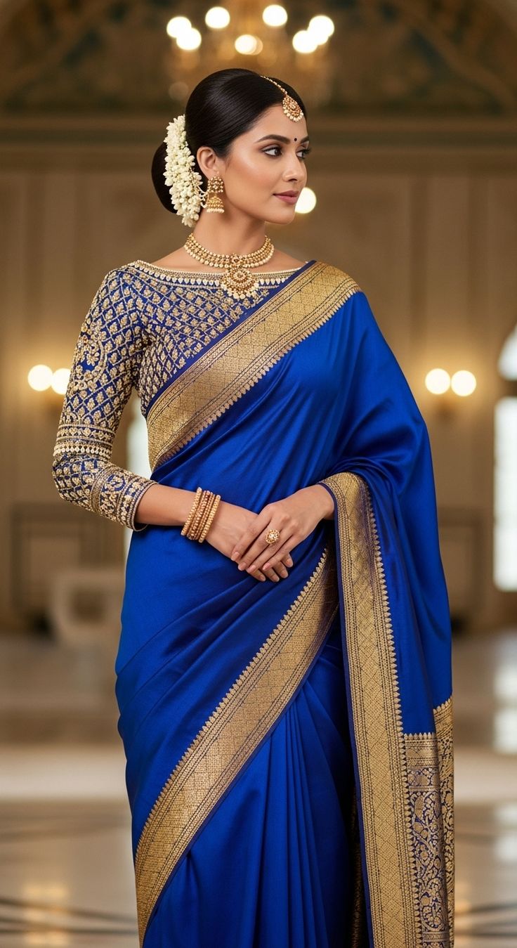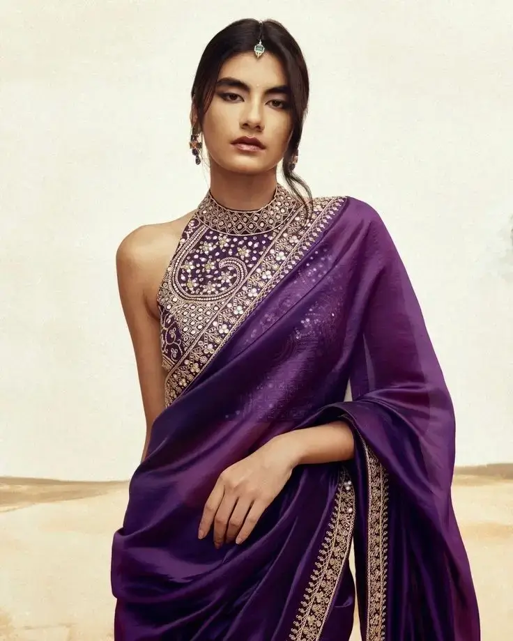 Backless blouses are one of the most glamorous celebrity-inspired styles. They often come with dori, tassels, or designer back patterns.