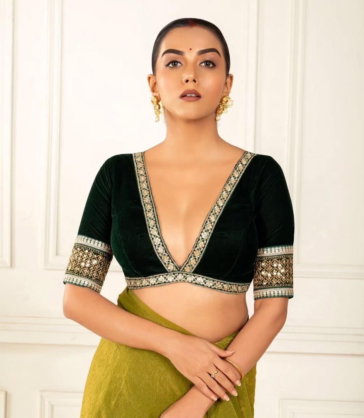 Velvet blouses are often seen in celebrity wedding looks. This fabric gives a rich and royal appearance.