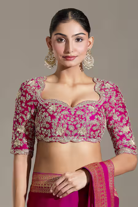 A zardozi readymade blouse looks luxurious with bridal silk sarees and wedding sarees.