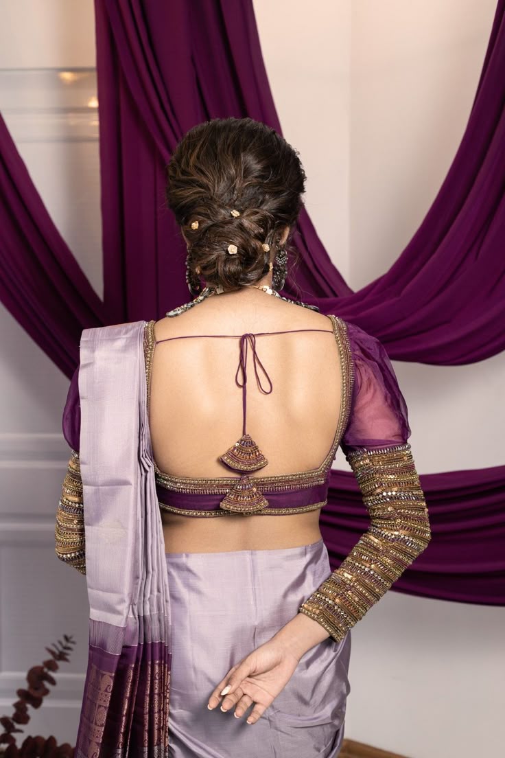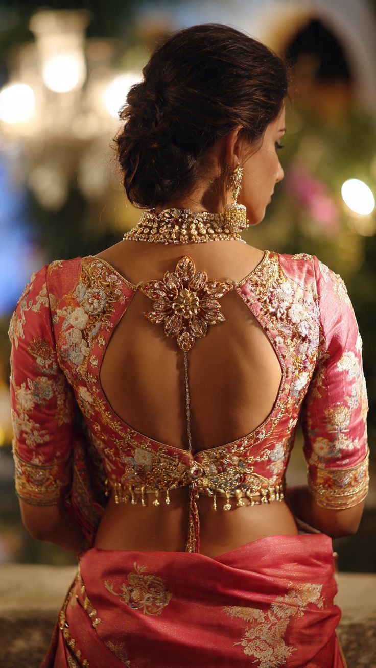 A deep back with dori and latkans looks festive and stylish without going too modern. It’s perfect when you want a mix of tradition + glamour.