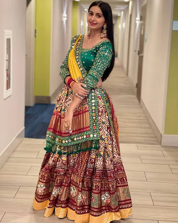 Mirror work instantly gives that authentic Rajasthan feel. Pair it with a Chunri saree for Garba nights, weddings, or festive pujas.