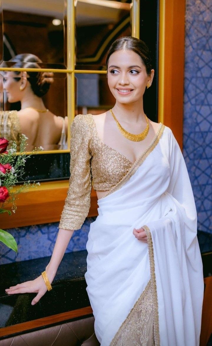 gold blouse is the easiest way to add glamour to a white saree. Whether it’s a silk, chiffon, or organza saree, a gold blouse complements it beautifully. Opt for handwork or sequined designs for a rich festive look. This combination is ideal for receptions, pujas, or festive dinners, as it gives you a radiant, goddess-like glow.