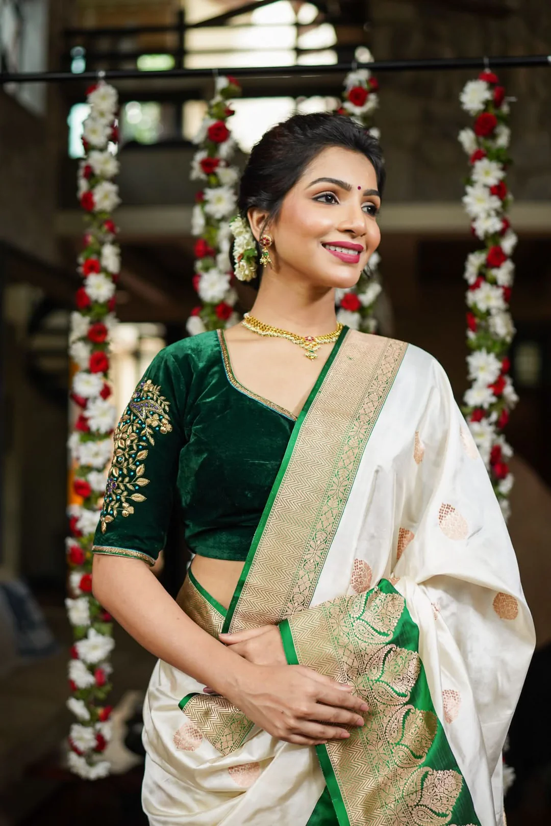 green blouse adds freshness and harmony to your white saree. Shades like emerald, bottle green, or parrot green work perfectly for day events and traditional ceremonies. A blouse with gold thread work or gota patti embroidery will make your saree look even more elegant. This combination is also a favorite for festive looks like Navratri or Diwali.