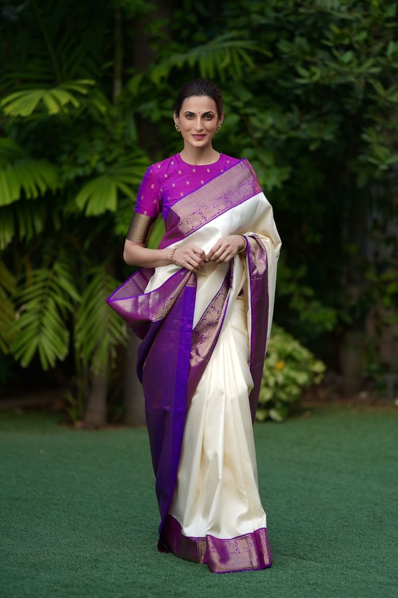 purple blouse with a white saree creates a regal and graceful look. Choose deep shades like plum or violet for an evening affair or lighter lavender tones for daytime elegance. Add stone or zari embroidery for a polished finish. This unique combination helps you stand out in style.
