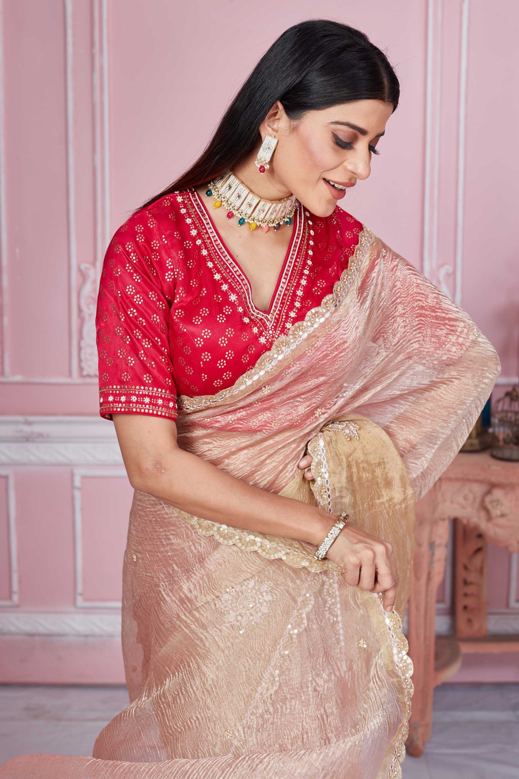 If you want to balance the boldness of red, pair your saree with a beige or cream blouse. The soft pastel tone works beautifully with red and is perfect if you like a minimal yet chic look.