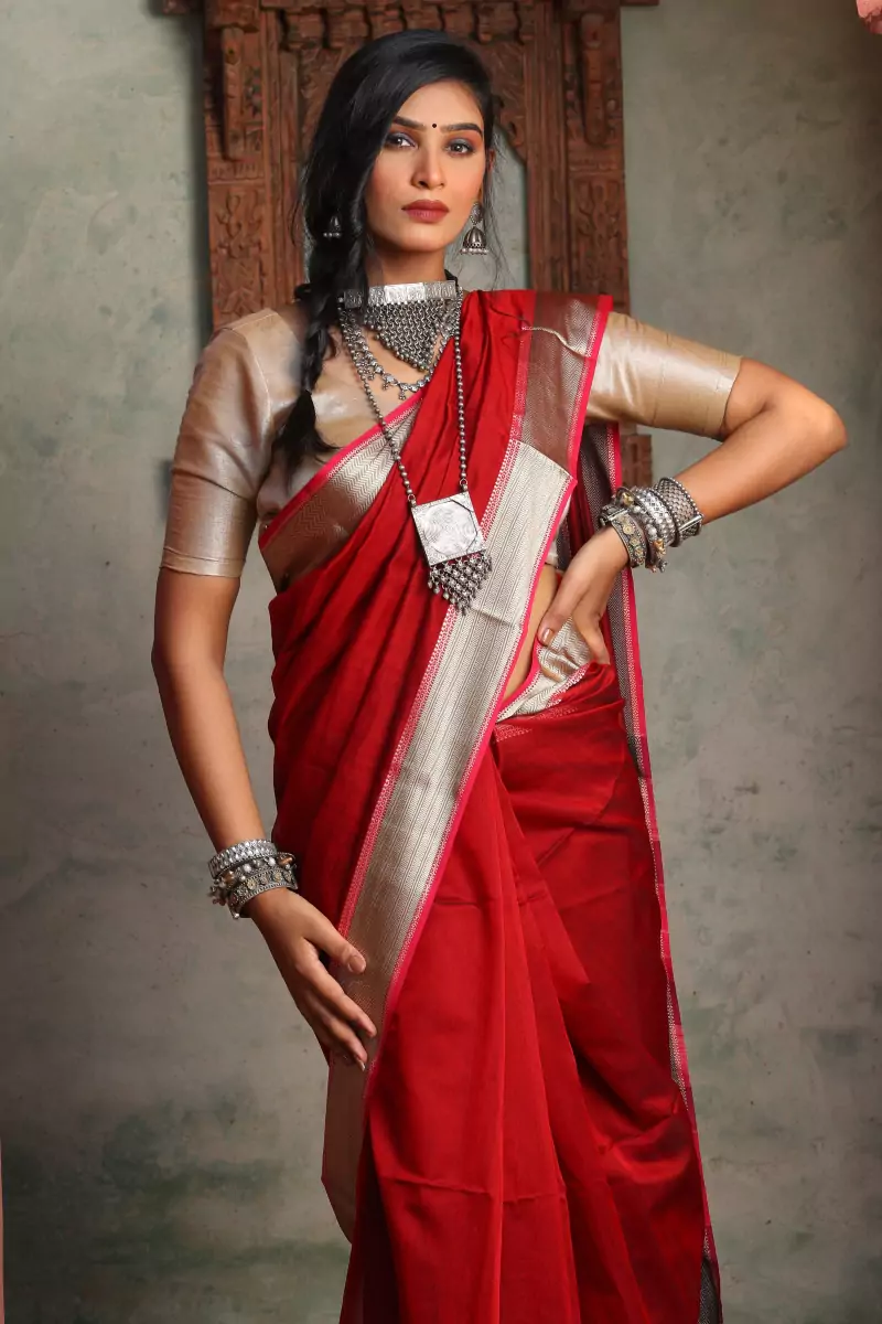 Ans: A golden zari blouse or a maroon brocade blouse is considered the most traditional and timeless choice with a red saree.