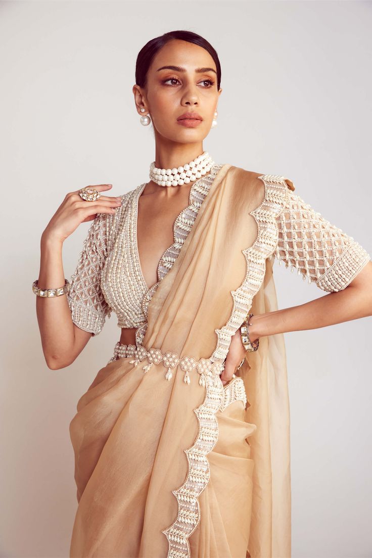 Peplum blouses are characterized by a flared, ruffled hemline that cinches at the waist, creating a flattering silhouette. These blouses add a touch of drama and sophistication to any saree or lehenga ensemble, making them a popular choice among fashion-forward women.