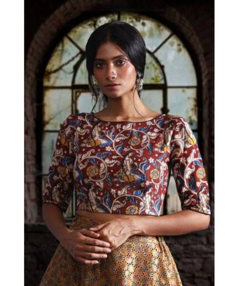 Kalamkari is a traditional Indian art form that involves hand-painting or block-printing on fabric. Blouses featuring Kalamkari designs are highly sought after for their exquisite craftsmanship and rich cultural appeal.