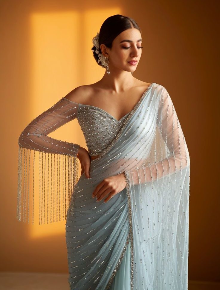 Sheer blouses with net sleeves or net panels add a soft and dreamy charm. They look stunning with modern sarees and lehengas. Choose pastel colors or embellished nets for a festive-ready style.