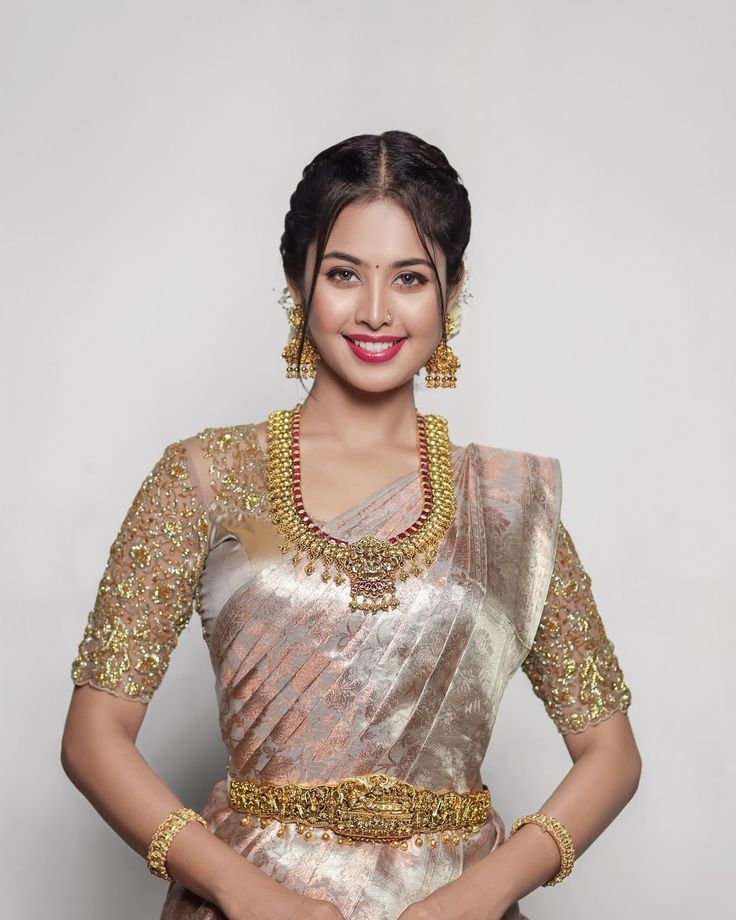 The traditional Maggam work blouse from South India is a favorite among brides. It features hand embroidery using zari, beads, and stones. This blouse design pairs beautifully with Kanjivaram, Pattu, or Paithani sarees, giving a grand bridal look.