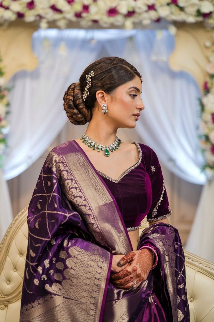 Velvet fabric gives an instant royal vibe. A velvet blouse with intricate hand embroidery in gold or copper tones adds depth and sophistication to your ensemble. Perfect for winter weddings, this blouse design keeps you warm while ensuring you look stunning.