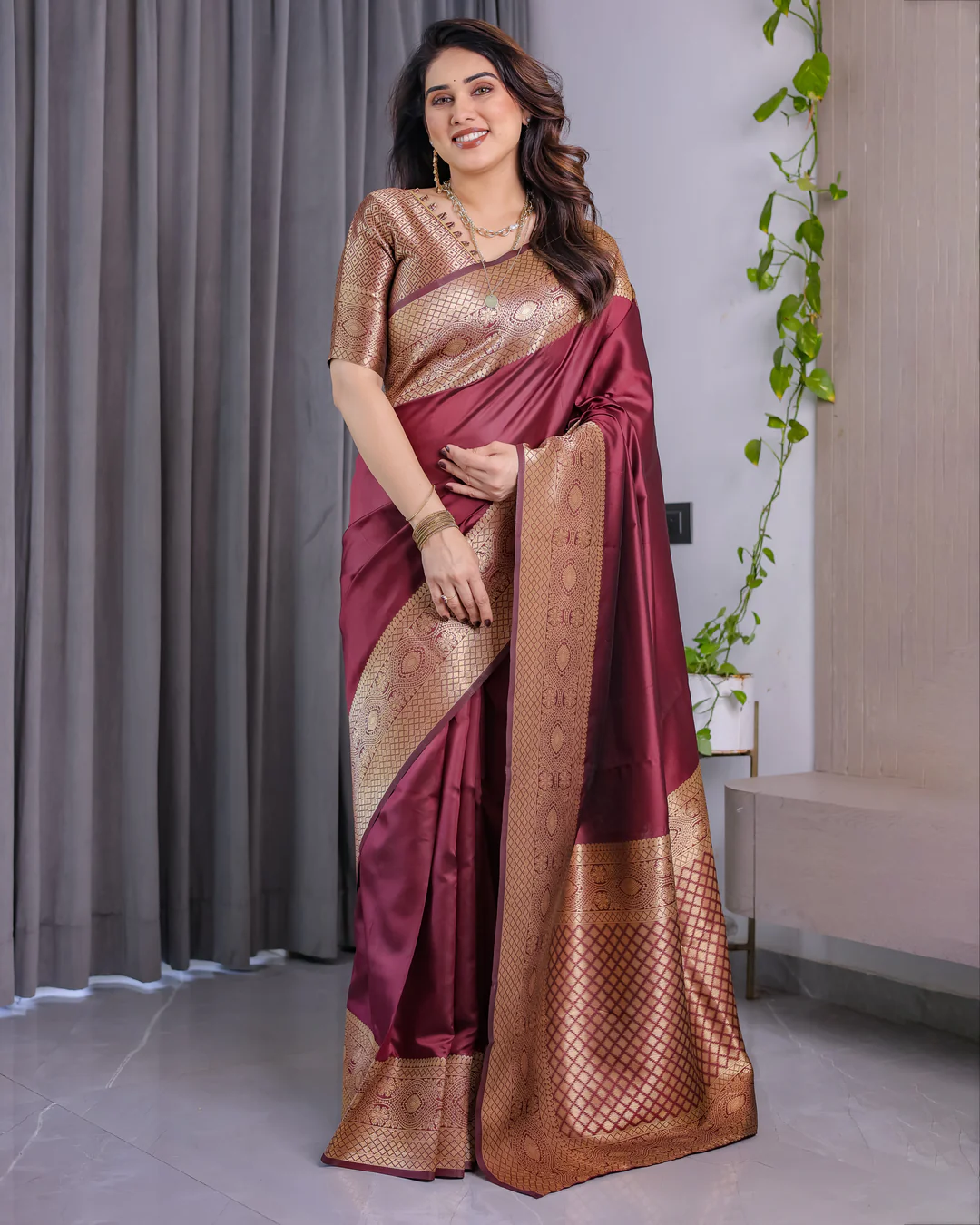 1. गोल्डन ब्लाउज के साथ मरून साड़ी