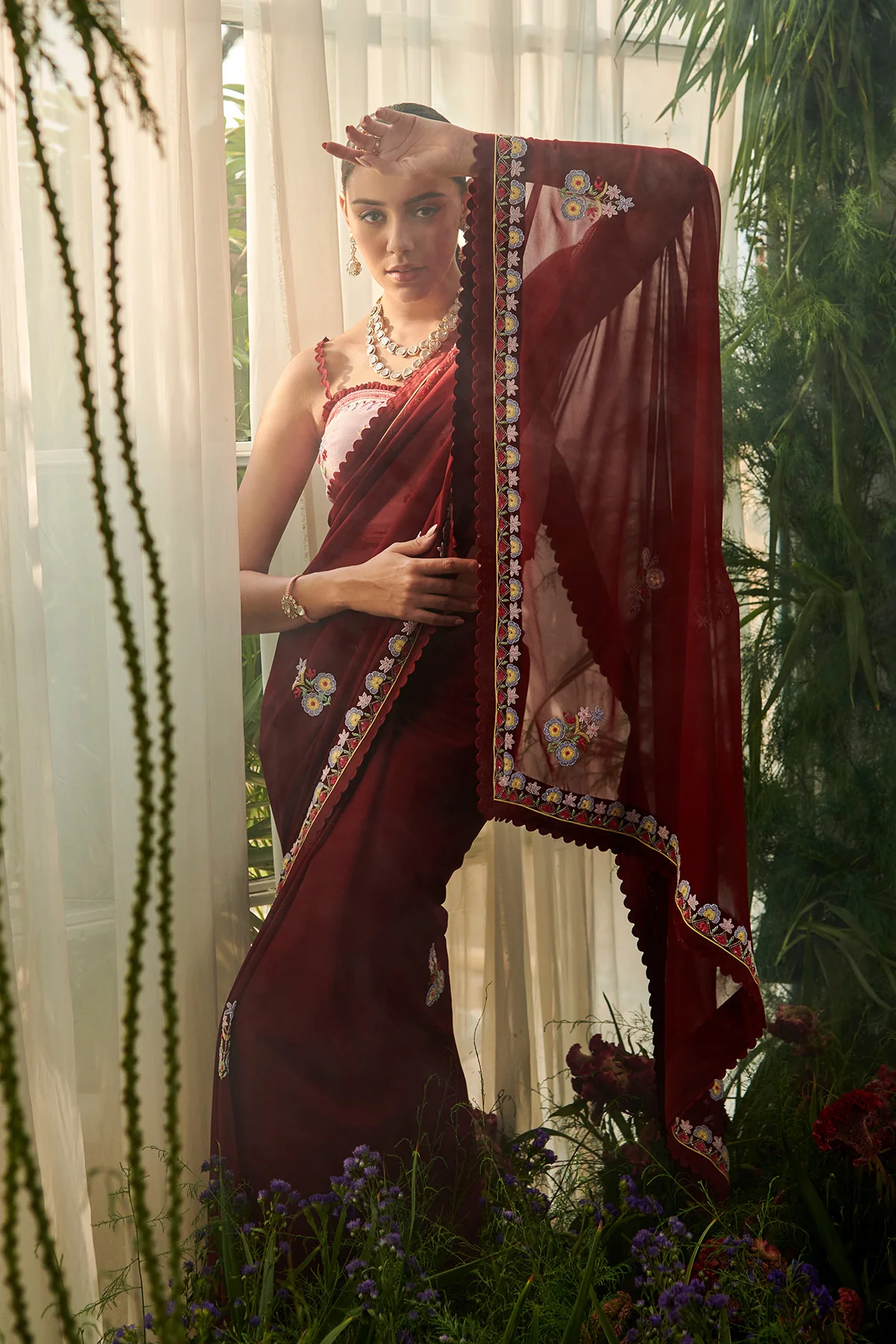 A5. हाँ, फ्लोरल या प्रिंटेड ब्लाउज मरून साड़ी के साथ बहुत अच्छा लगता है, खासकर डे फंक्शन और समर इवेंट के लिए।