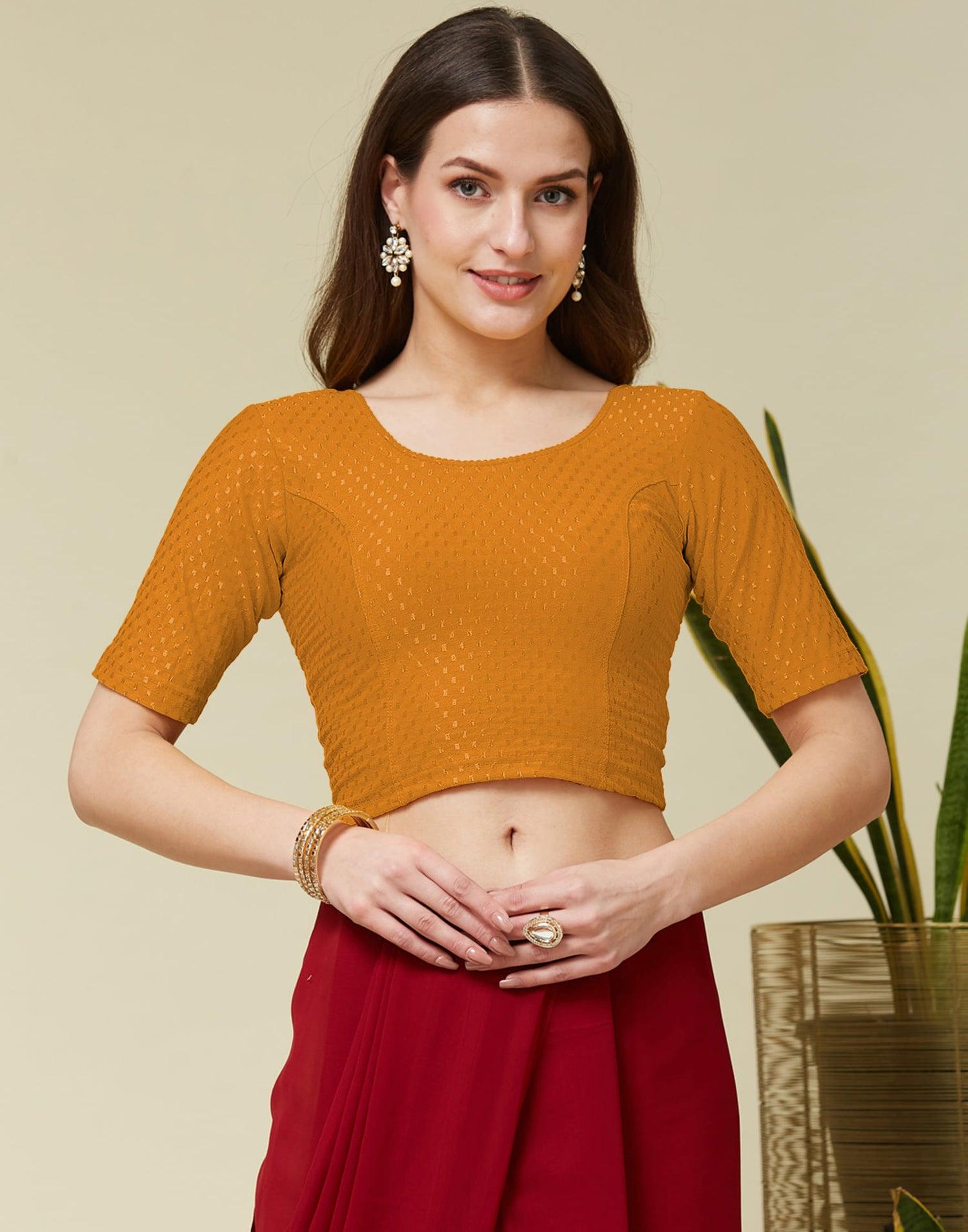 मस्टर्ड येलो ब्लाउज बहुत ही ब्राइट और फेस्टिव लुक देता है। यह कॉम्बिनेशन खासकर नवरात्रि और फेस्टिव सीजन में काफी ट्रेंड में रहता है। यह आपके लुक को फ्रेश और एनर्जेटिक बनाता है। आप इसमें मिरर वर्क या एम्ब्रॉयडरी डिज़ाइन चुन सकती हैं।