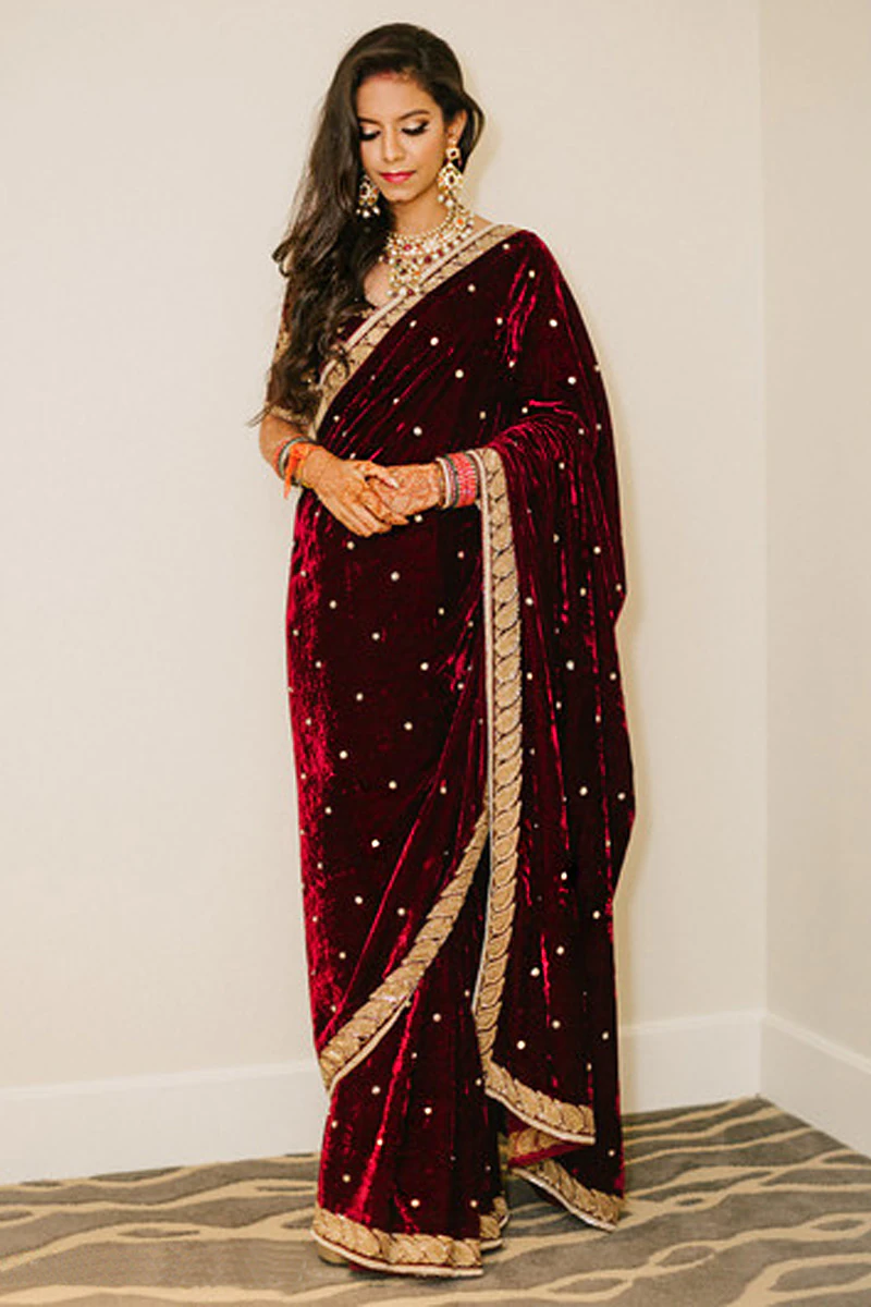वेलवेट ब्लाउज सर्दियों के लिए एक परफेक्ट ऑप्शन है। यह आपके लुक को रिच और रॉयल बनाता है। यह खासकर ब्राइडल और वेडिंग फंक्शन के लिए बेस्ट होता है।