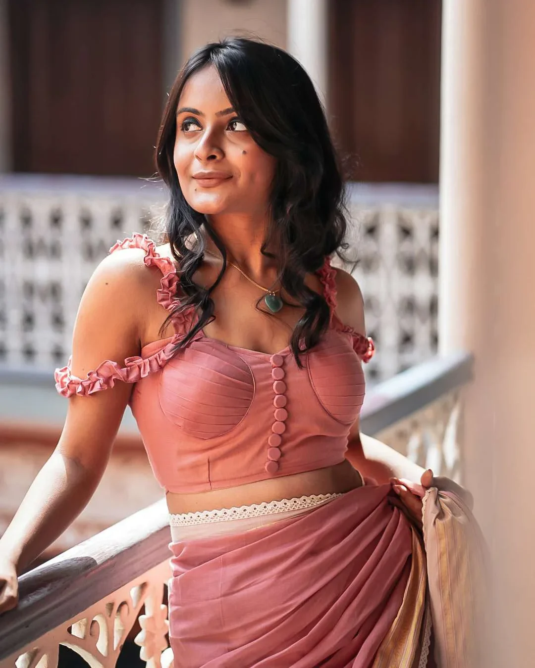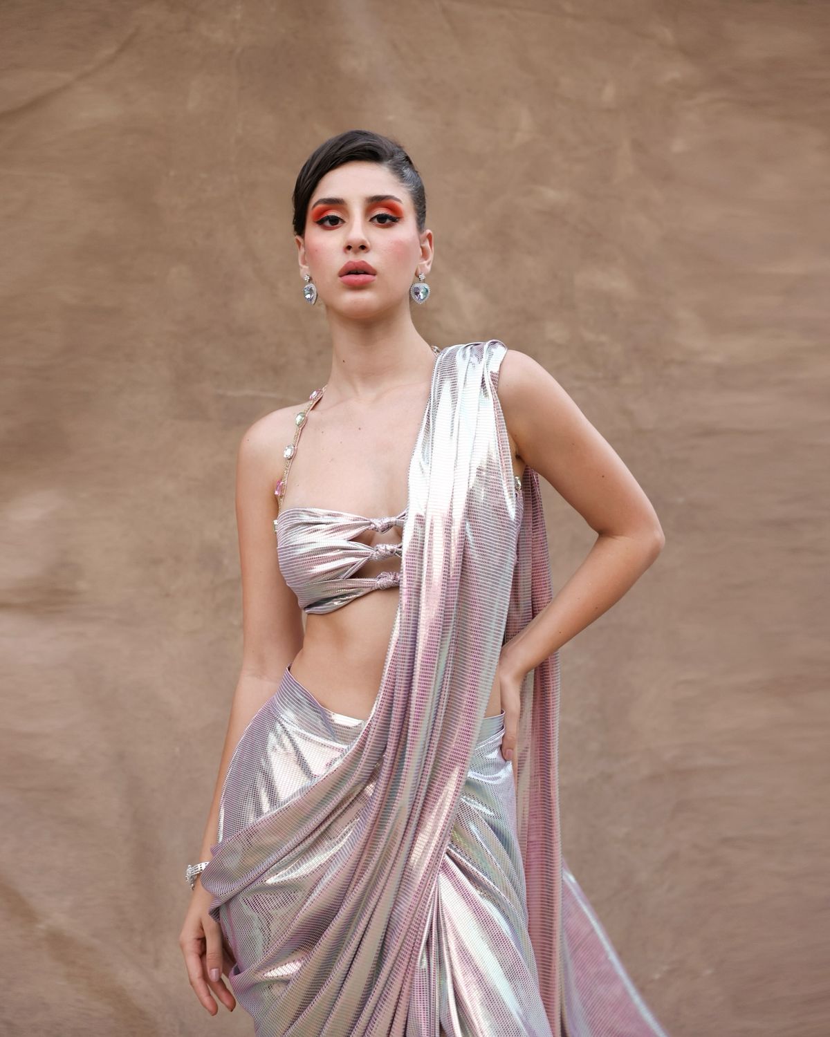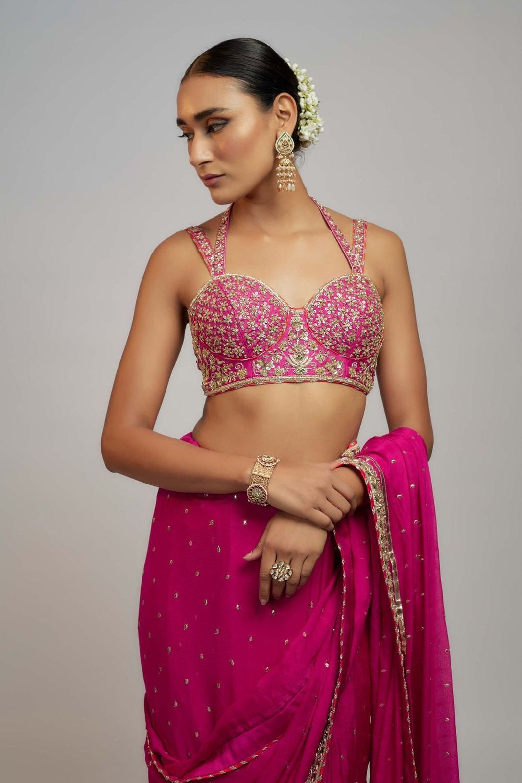 Corset-style blouses are trending big this year! A noodle strap corset blouse enhances your figure while adding a structured look. It’s ideal for lehengas or draped sarees for pre-wedding shoots or sangeet nights.