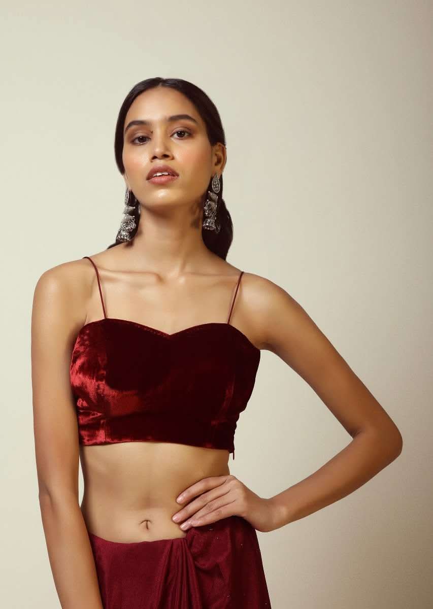 Nothing beats the royal feel of velvet fabric. A velvet noodle strap blouse looks rich, warm, and perfect for winter weddings. Deep colors like maroon, royal blue, or forest green make this blouse a timeless pick. The texture adds depth and enhances the saree drape beautifully.