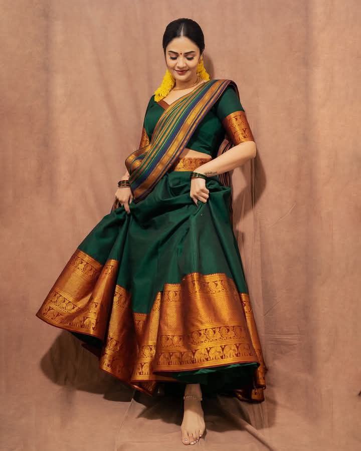 Wearing a contrast blouse instantly highlights your outfit. For example, a green langa with a pink blouse or a blue skirt with a yellow blouse always stands out beautifully.