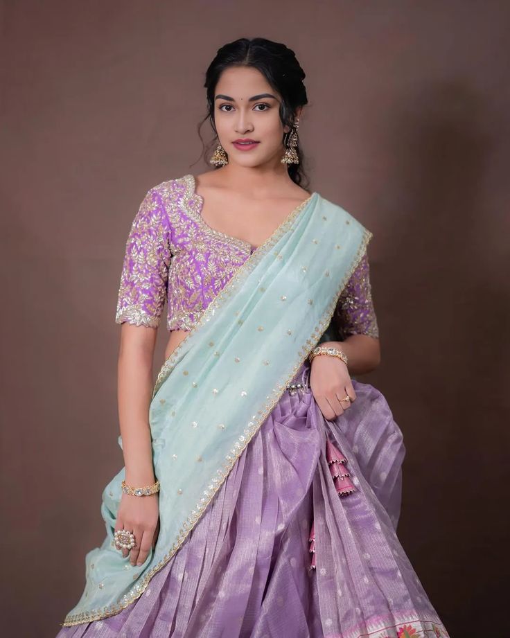 Silk, brocade, and zari-bordered blouses suit traditional langa voni the most. These fabrics enhance the festive look and match well with pattu pavadai.