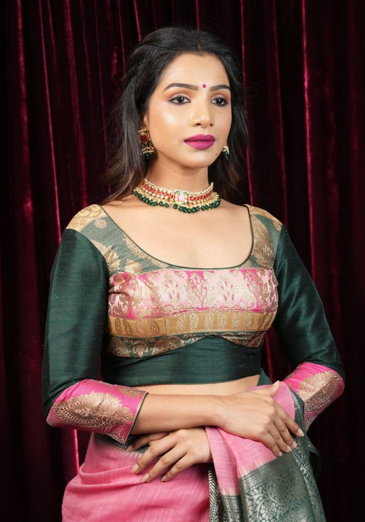 If you’re looking for a playful yet stylish option, a pink readymade blouse is perfect. This bright colour brings your outfit a fun and vibrant feel, ideal for festive gatherings.