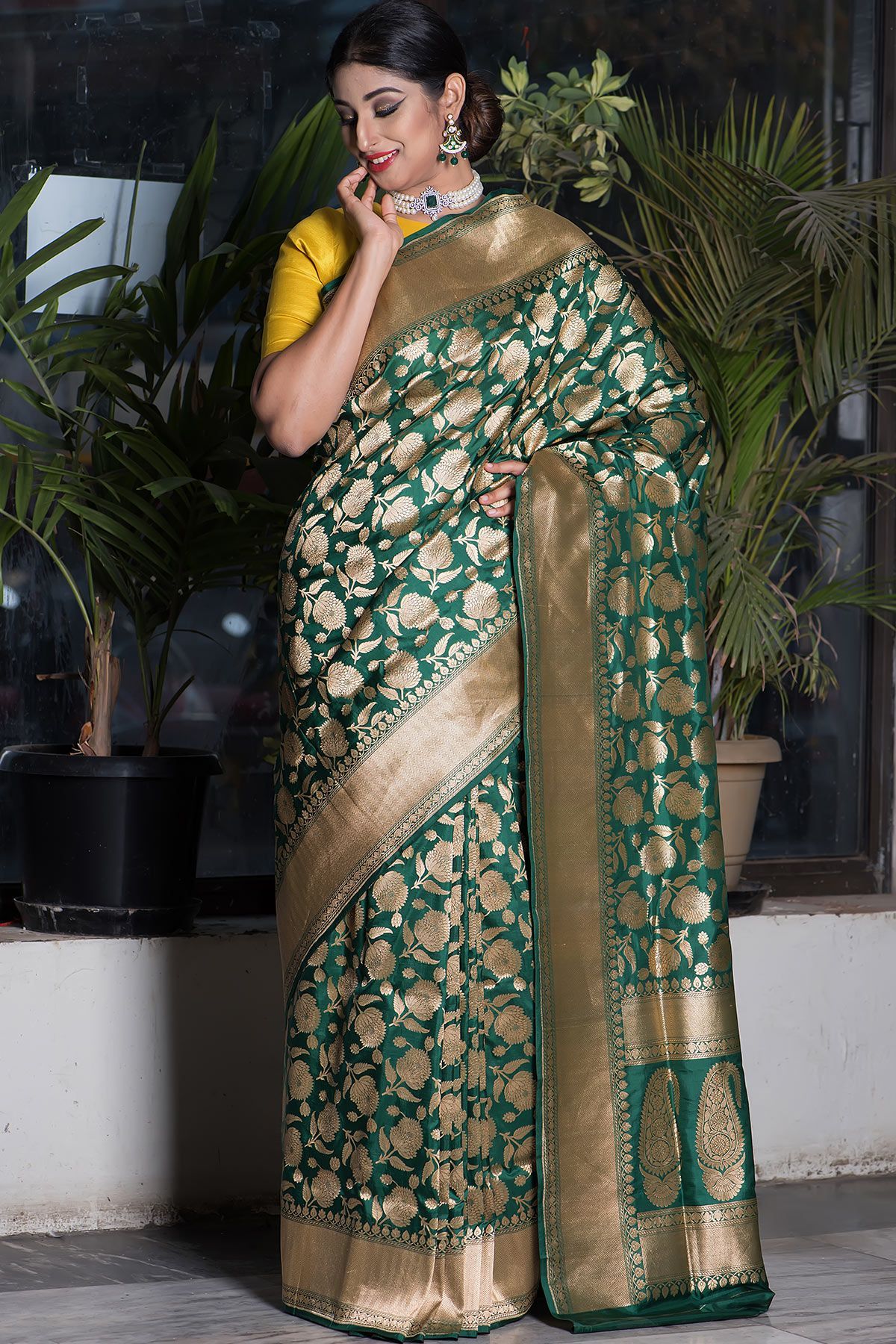 From emerald green to olive tones, every shade of green looks classy and festive. A silk or Banarasi green saree with golden zari work is perfect for evening celebrations.