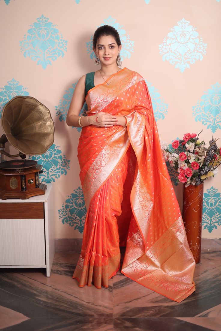 A bright orange saree in silk or chiffon can make you stand out beautifully. It’s both traditional and trendy, giving you the perfect festive balance.