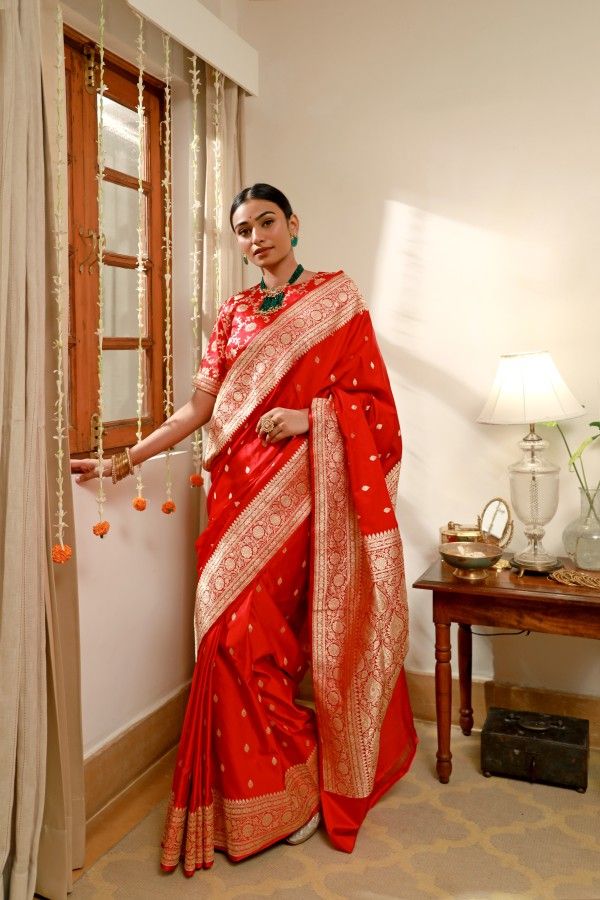 A red saree can never go out of style. Whether you choose a Banarasi silk saree, Kanjivaram, or a georgette saree with zari work, red instantly gives you a royal and festive look.