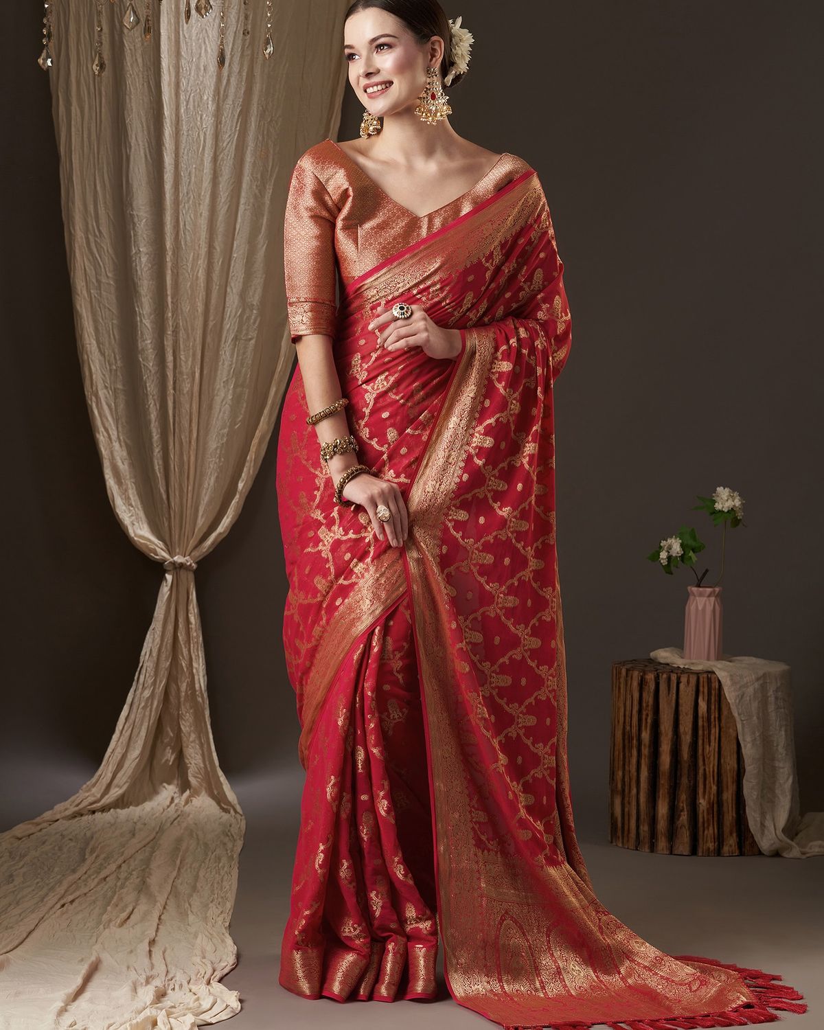 Nothing says royalty like a Banarasi silk saree. Its intricate zari weaving and luxurious texture make it a favorite for festivals. A red or maroon Banarasi saree adds an instant glow to your look.