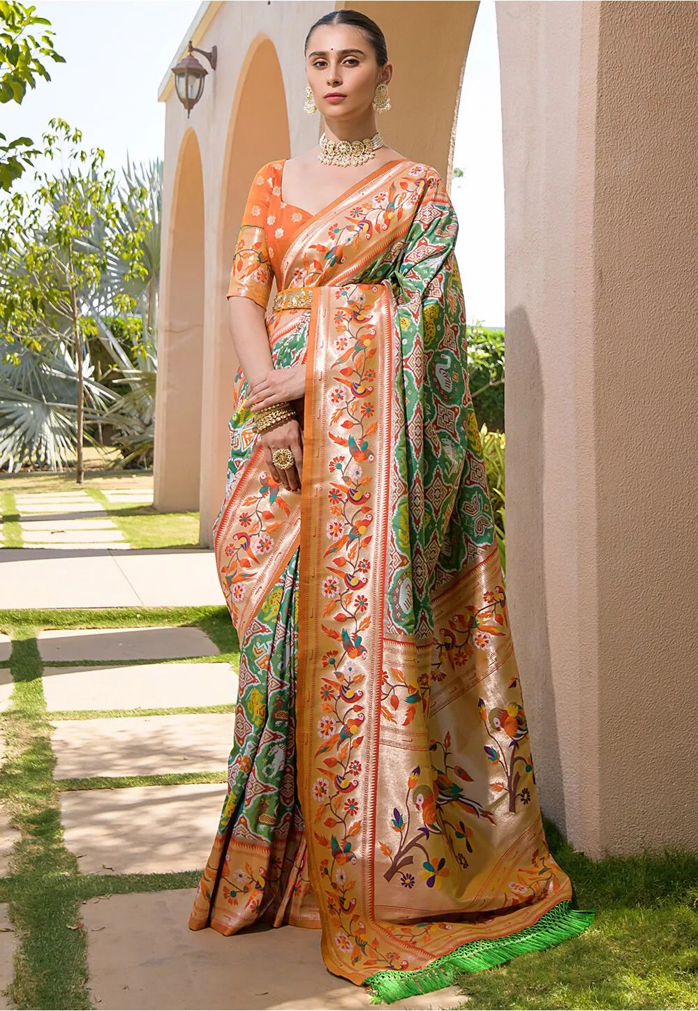 A Paithani silk saree from Maharashtra is a timeless masterpiece. Its colourful pallu, peacock motifs, and luxurious feel make it a wonderful pick for Karwa Chauth.