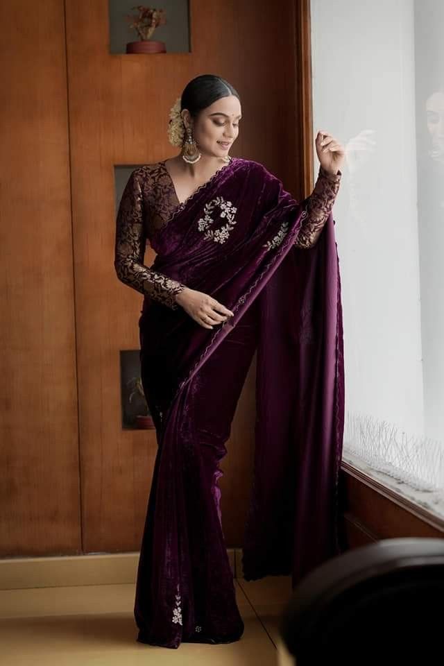 A velvet saree exudes luxury and class. Its rich fabric and deep tones like wine, maroon, or emerald green make it ideal for a festive night like Karwa Chauth.
