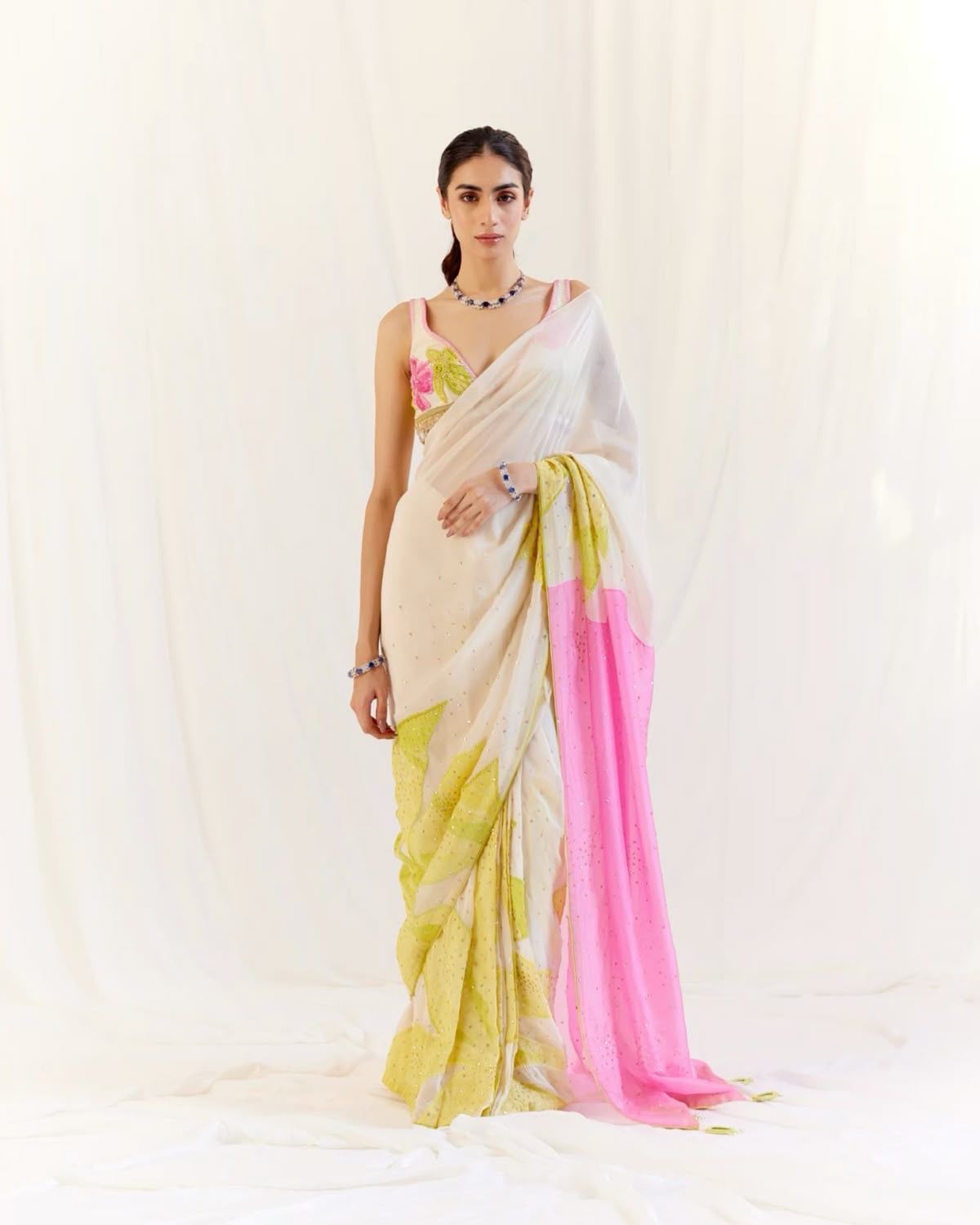 Style Tip: Add a colorful pallu drape for an eye-catching style.