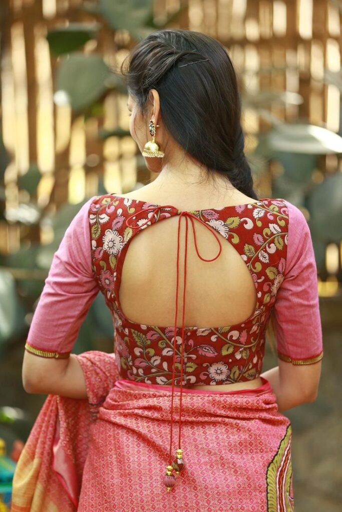 The back neck design is a key feature in any blouse. Kalamkari blouses offer a range of back neck styles, including deep U, V-shaped, or keyhole designs, often adorned with tassels or tie-ups for added charm.