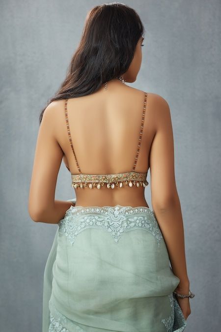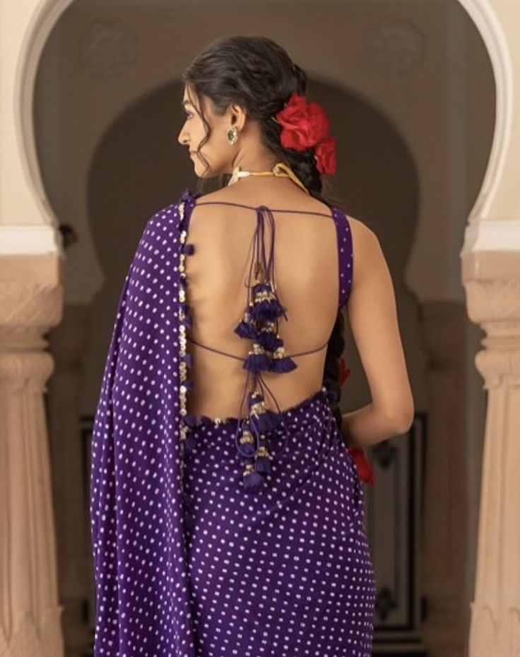 Deep back blouses are perfect for creating a glamorous and stylish look. These blouses often include tie-up strings, tassels, or latkans at the back, adding extra charm to your saree outfit.