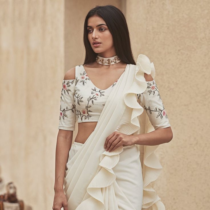 Cold shoulder blouses are fashionable and trendy. This design is perfect for women who want a modern and stylish saree look.