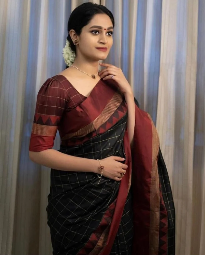 The most iconic pairing for a Sungudi saree is a plain contrast cotton blouse with traditional temple borders on the sleeves. A maroon, mustard, bottle green or deep blue blouse with zari temple border looks rich yet rooted in tradition. This style works for all age groups and almost every Sungudi colour combination.