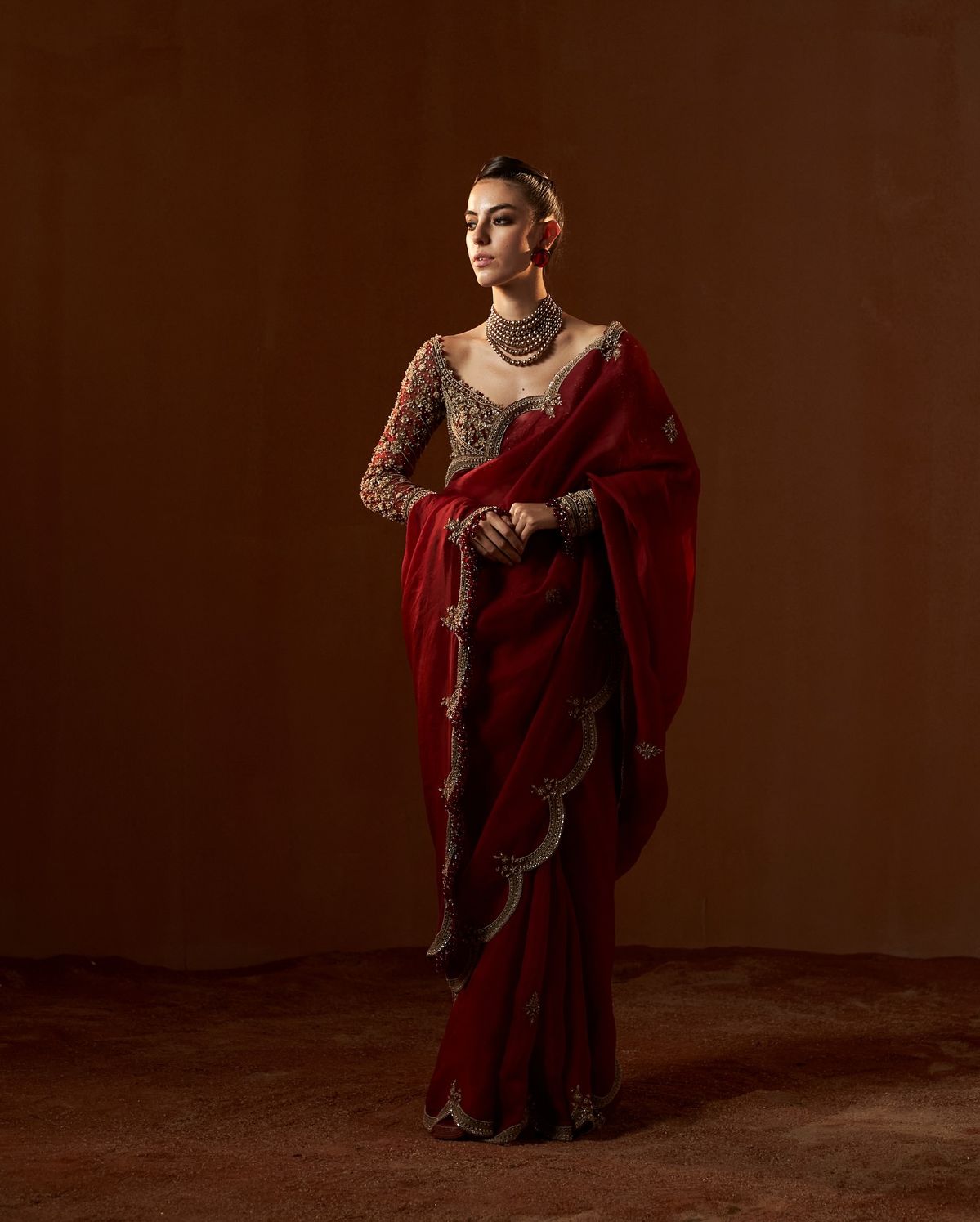 A burgundy saree looks stunning under lights and photographs beautifully.