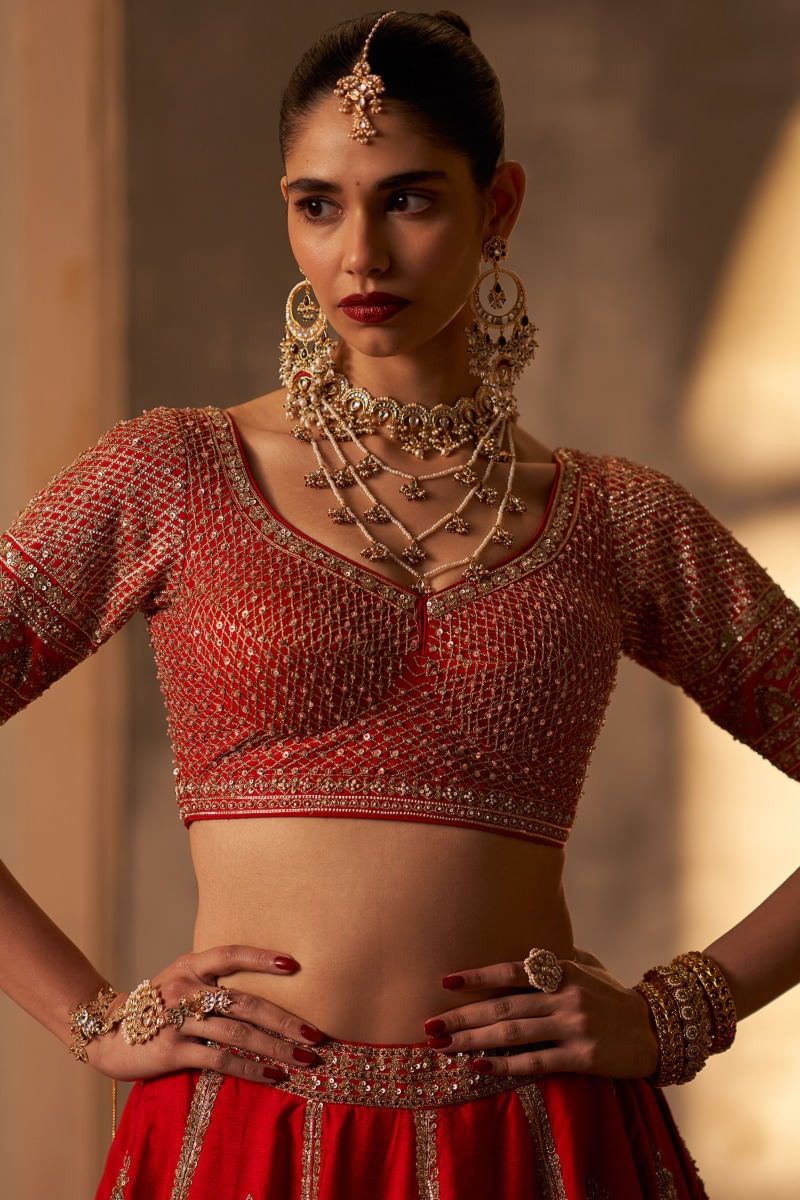 A4.High neck, boat neck, princess cut, and elbow sleeve blouses balance heavy lehengas and give a rich finish.