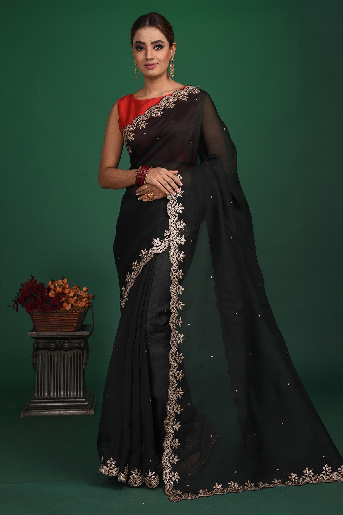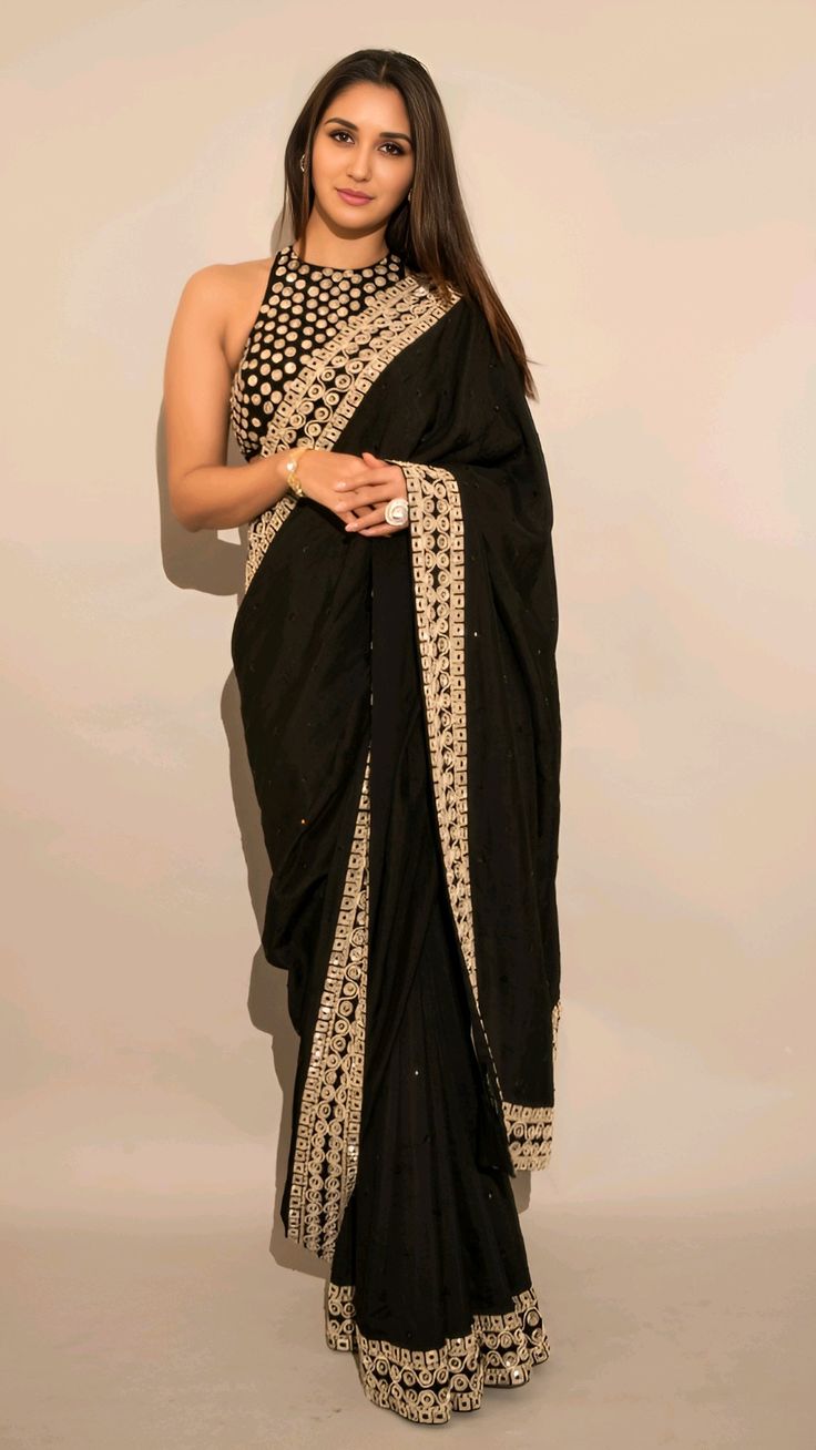 Chiffon is a light and flowy fabric that gives a soft and feminine look. When combined with black color, it creates a classy and bold style. Black chiffon sarees are loved because: