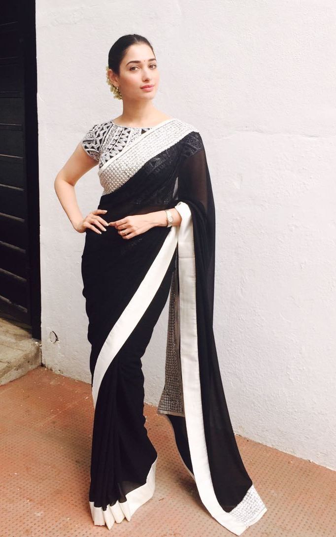 For a modern and classy style, go for a white or off-white blouse with your black chiffon saree. This combo gives a fresh and elegant vibe.