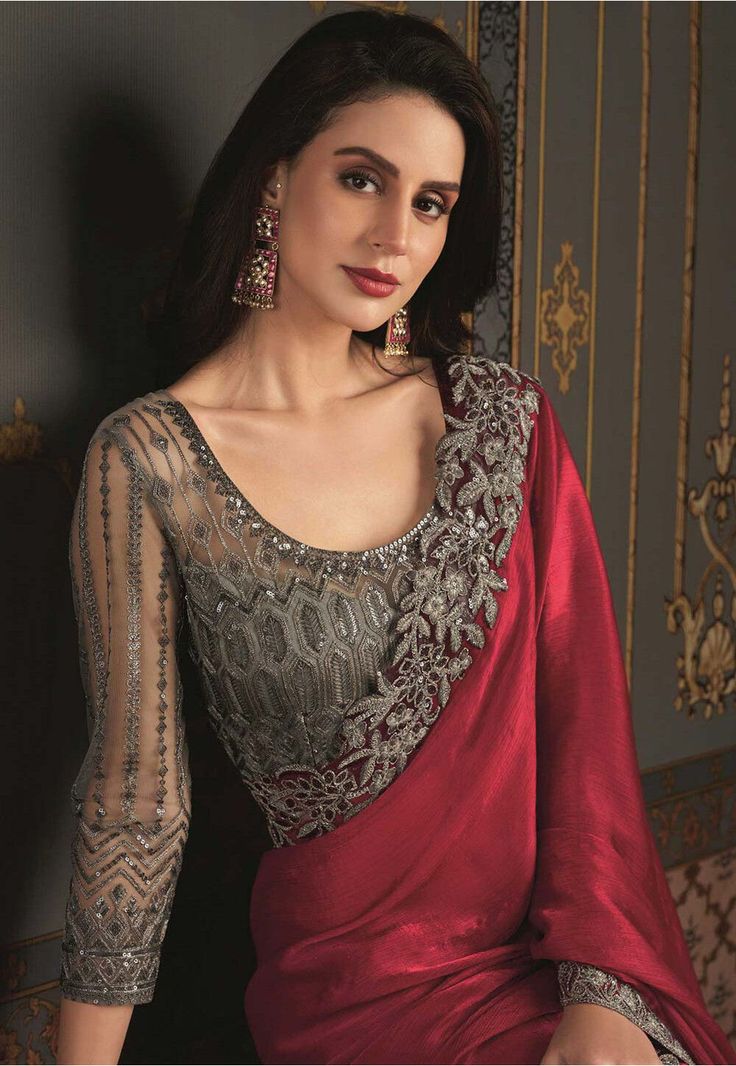A silver blouse adds a cool tone to the warm red saree. It’s perfect for parties and contemporary functions. Grey or metallic shades also look stunning and trendy.