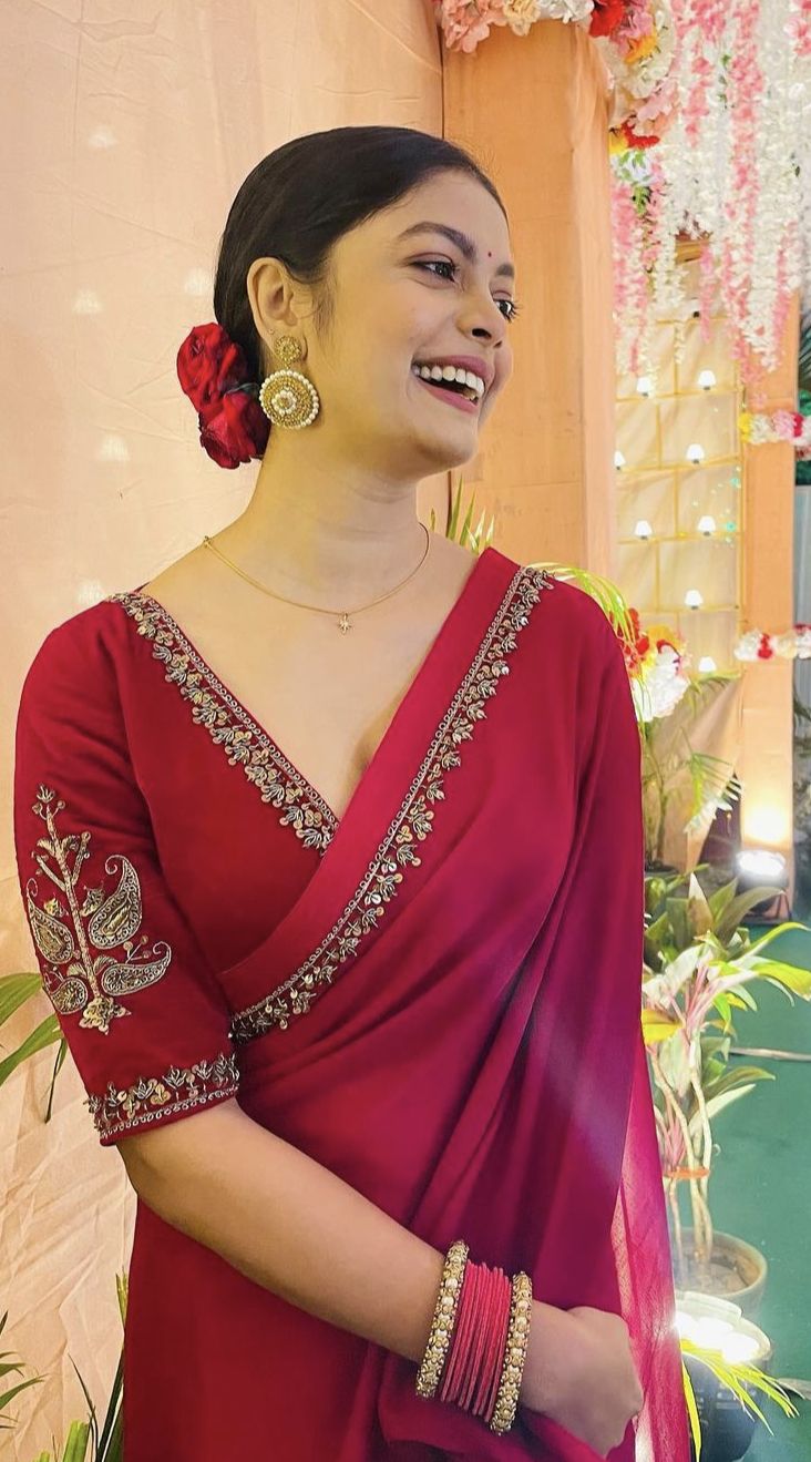 - Pair heavy, wide-neck blouses with plain sarees for balance.