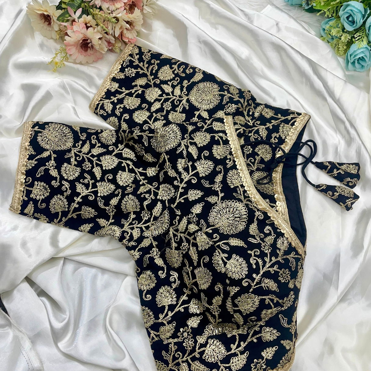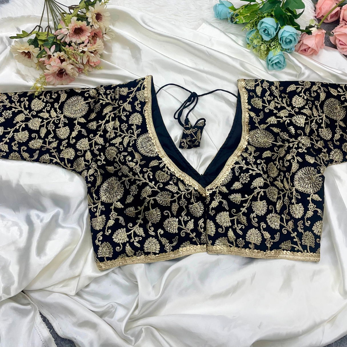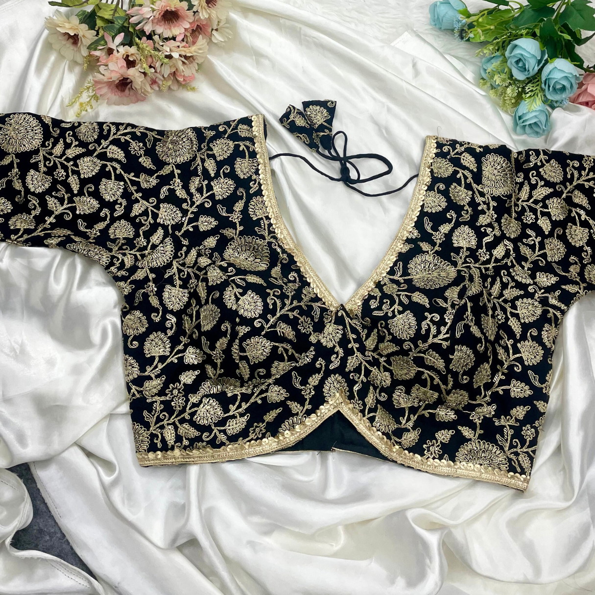 Make a bold statement with this stunning black deep neck blouse featuring intricate golden thread embroidery. Perfect for festive and party occasions, this readymade blouse blends tradition with a touch of glamour. Designed for confident women, our readymade blouse offers timeless elegance with unmatched comfort and graceful detailing in every stitch.