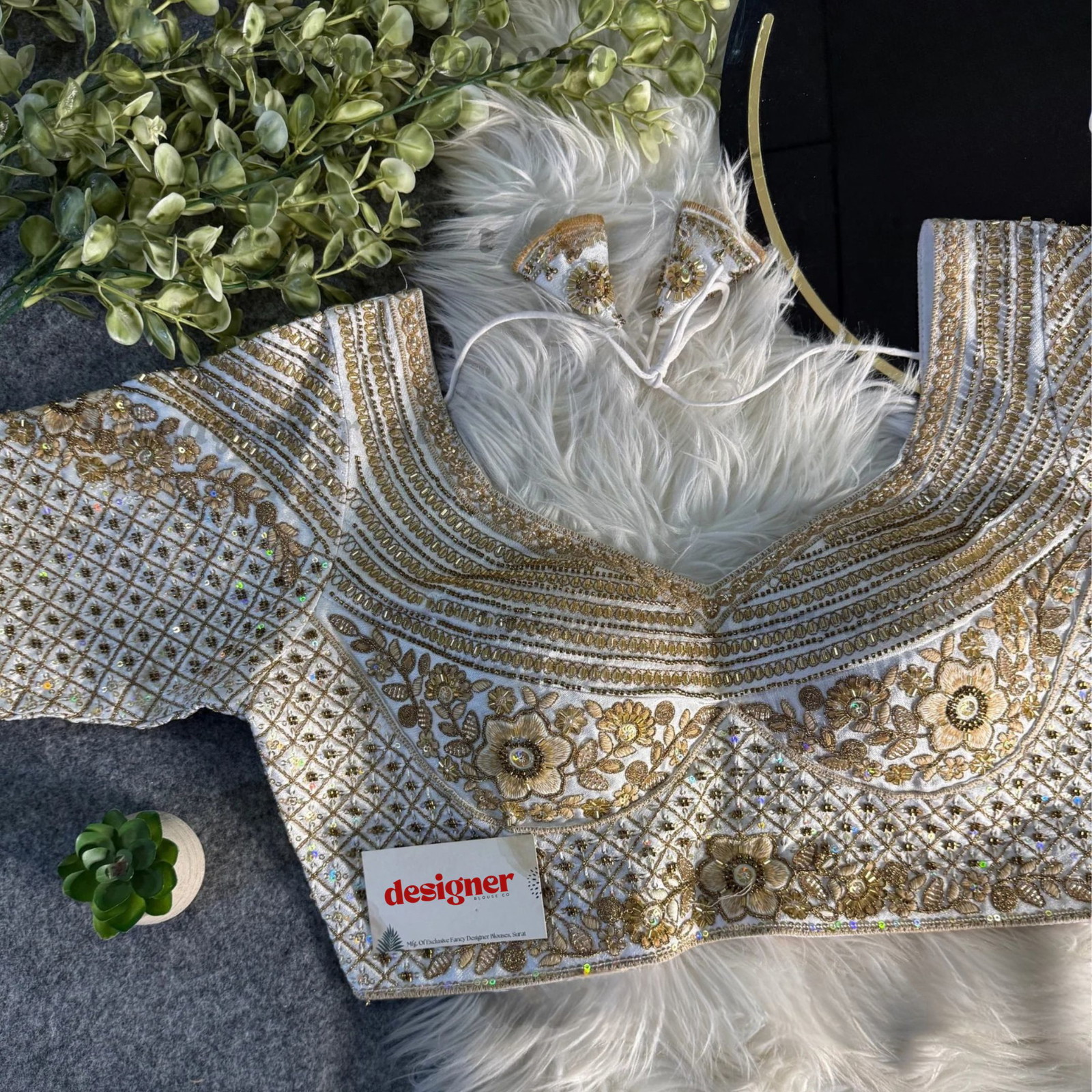 Elevate your bridal look with this Sabyasachi inspired blouse design in heavy georgette. Rich codding and shimmering sequins highlight the iconic Sabyasachi blouse design, paired with breathable cotton lining and built-in pads. this readymade blouse alterable 34–42 sizes—perfect for weddings, sangeet, and grand festive events.
