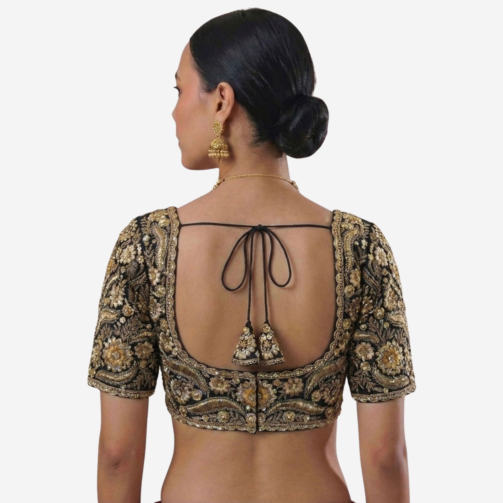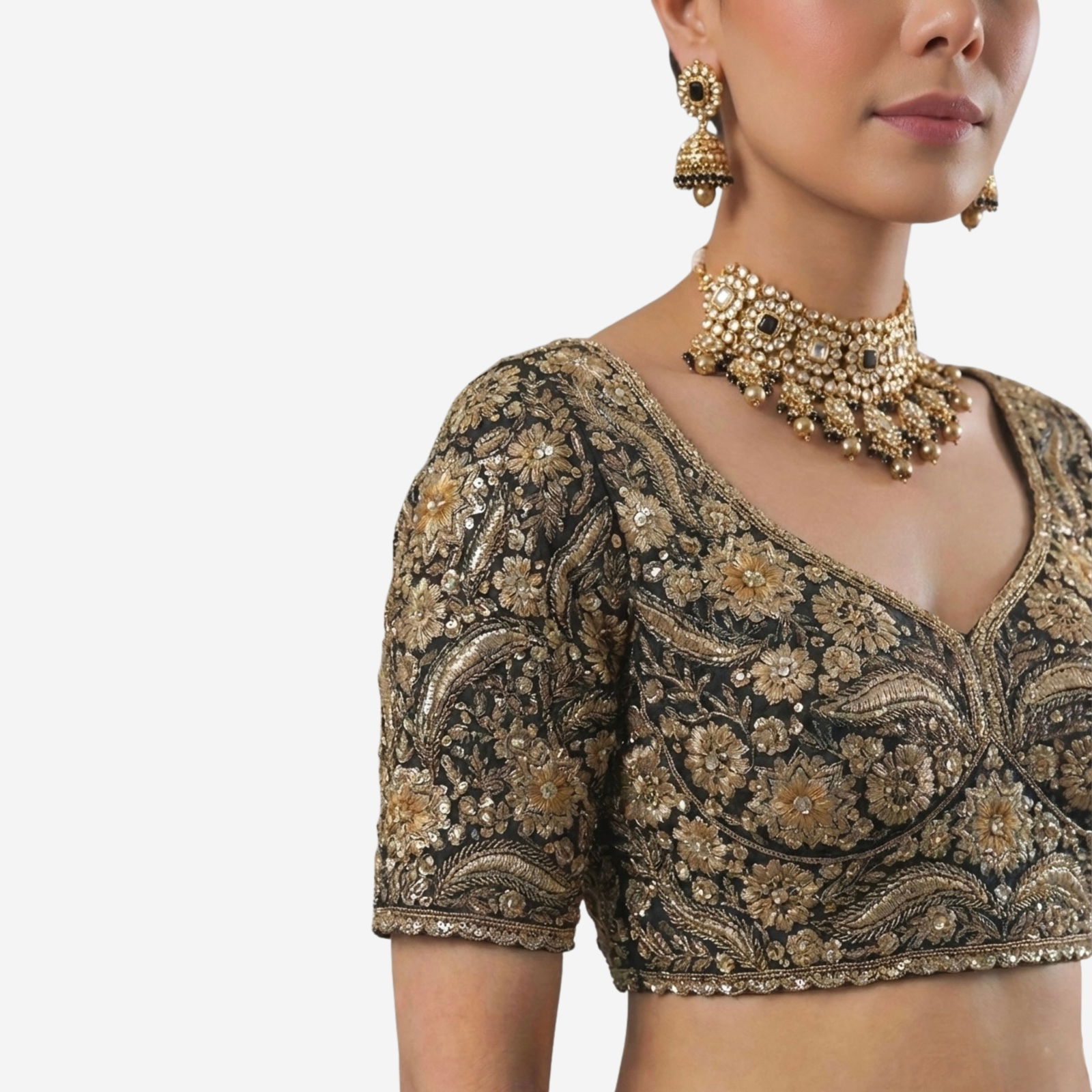 Elevate your bridal look with our Sabyasachi neck Italian Silk readymade blouse, richly embroidered with jari work. This designer bridal blouse offers a regal fit, cotton lining, and padding for comfort. Perfect for weddings, sangeet, and receptions, it pairs beautifully with sarees or lehengas for luxury and a radiant shine.