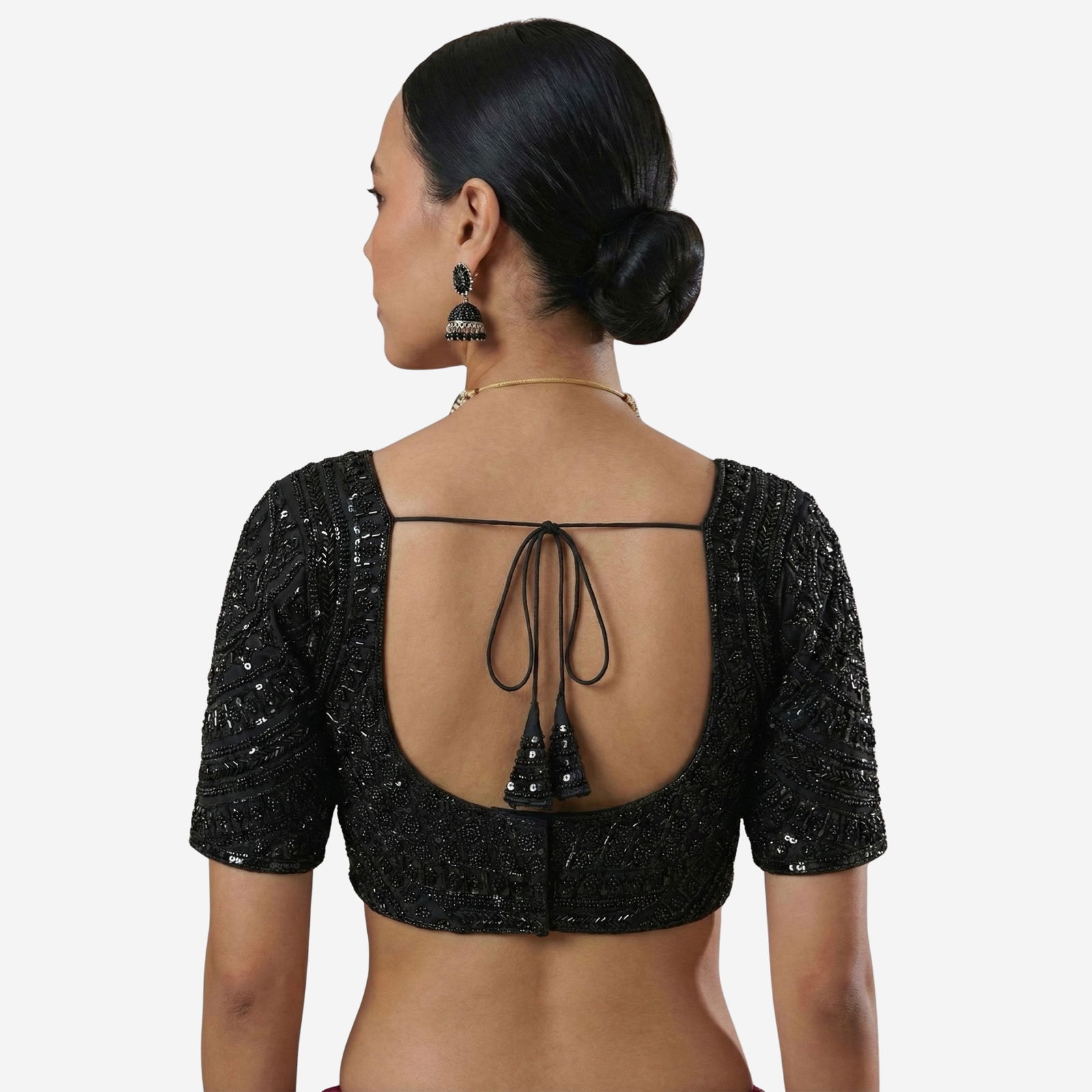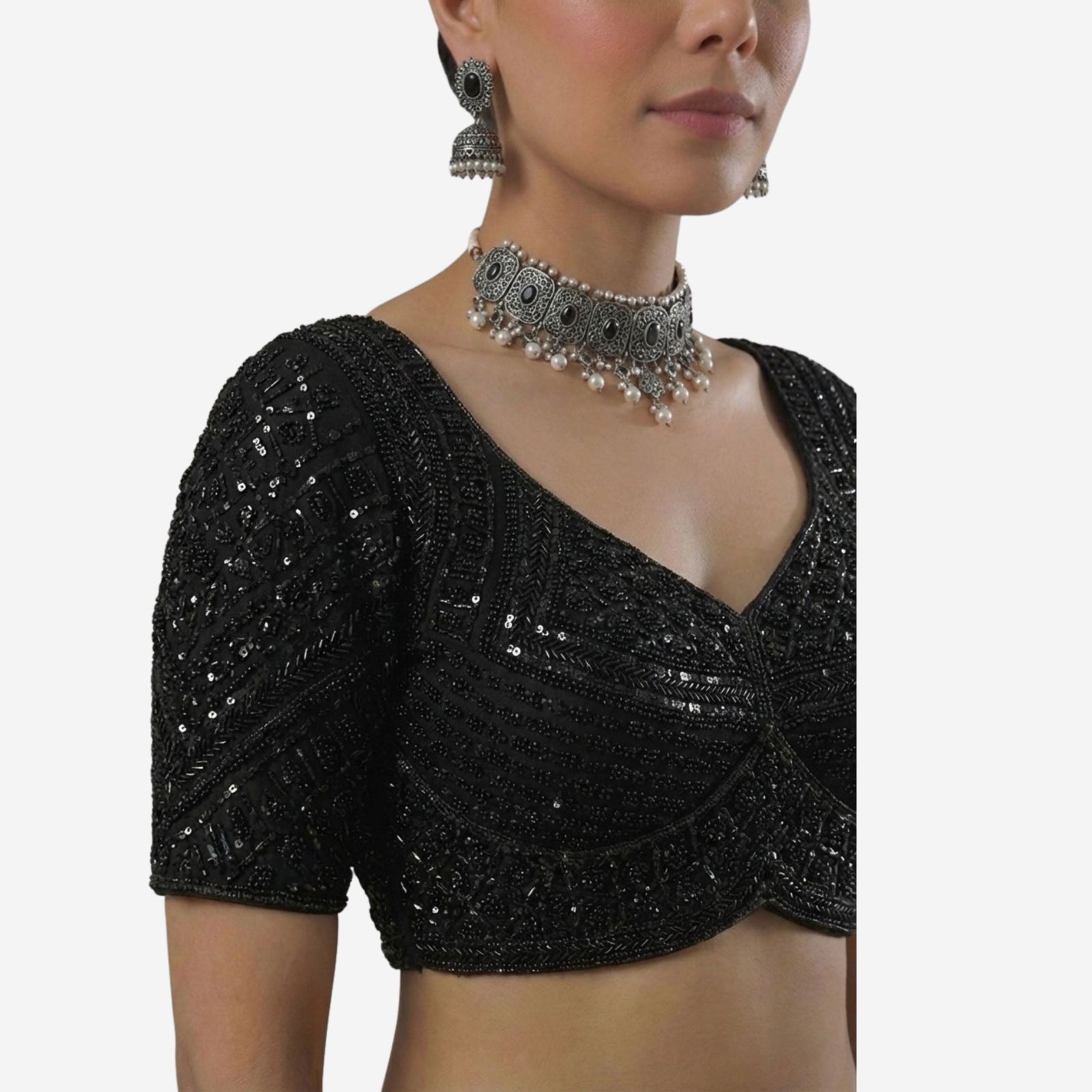 Glow in weddings and festive nights with this Rani Color Designer Partywear Blouse featuring a stunning Sabyasachi neck. Crafted in premium pure fox georgette, it’s richly finished with heavy hand embroidery and beadwork on front and sleeves. Soft cotton lining and built-in padding ensure comfort with a secure back-hook closure.